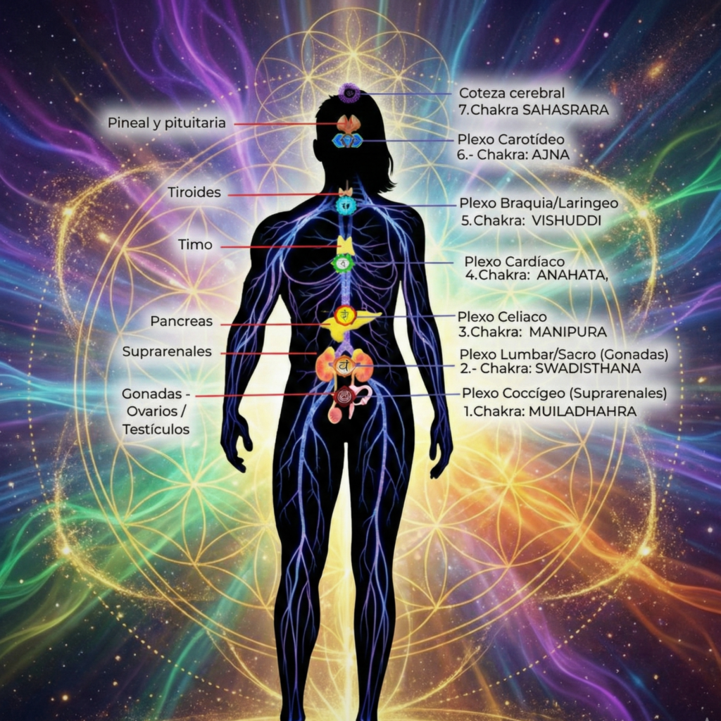 Lagunas veces, en el mundo del bienestar, hablamos de “equilibrar nuestra energía” como si fuera un concepto puramente metafórico. Sin embargo, cuando analizamos la anatomía humana, descubrimos una coincidencia fascinante: los antiguos centros energéticos o chakras se alinean con una precisión asombrosa con los principales plexos nerviosos y glándulas endocrinas de nuestro cuerpo.